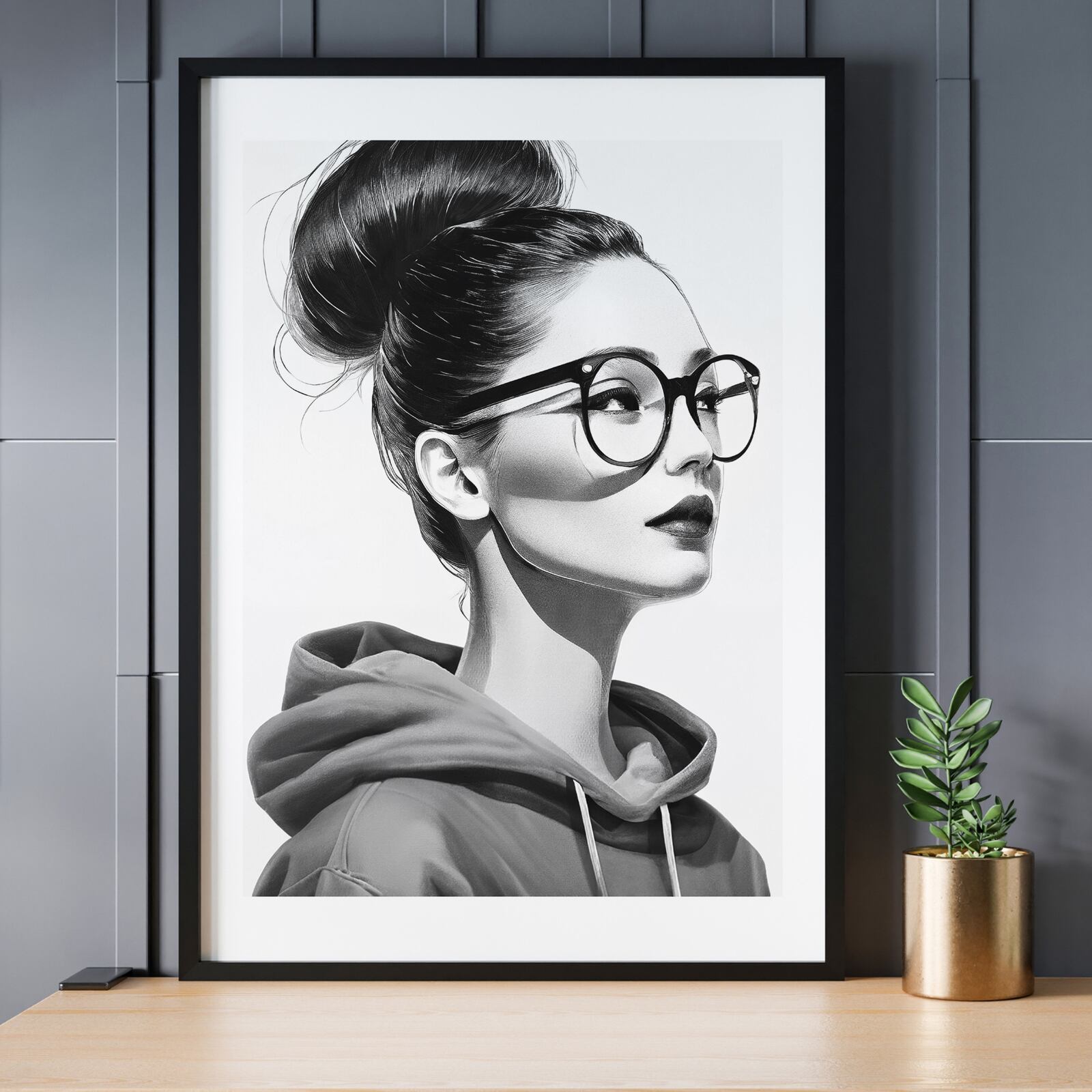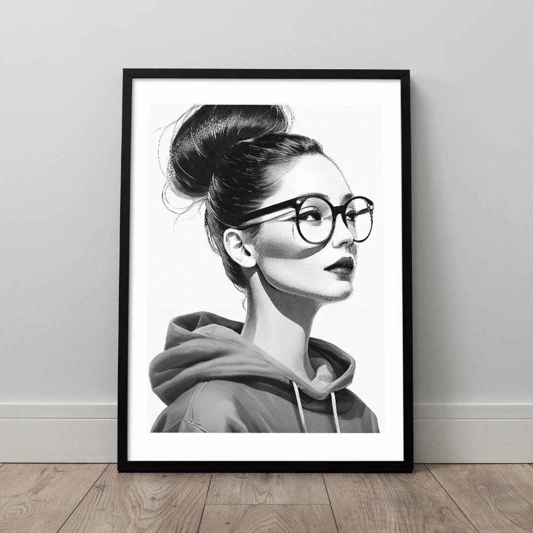 現代的でスタイリッシュな若い女性が描かれたモノクロポスターはカジュアルなインテリアとよく合います。